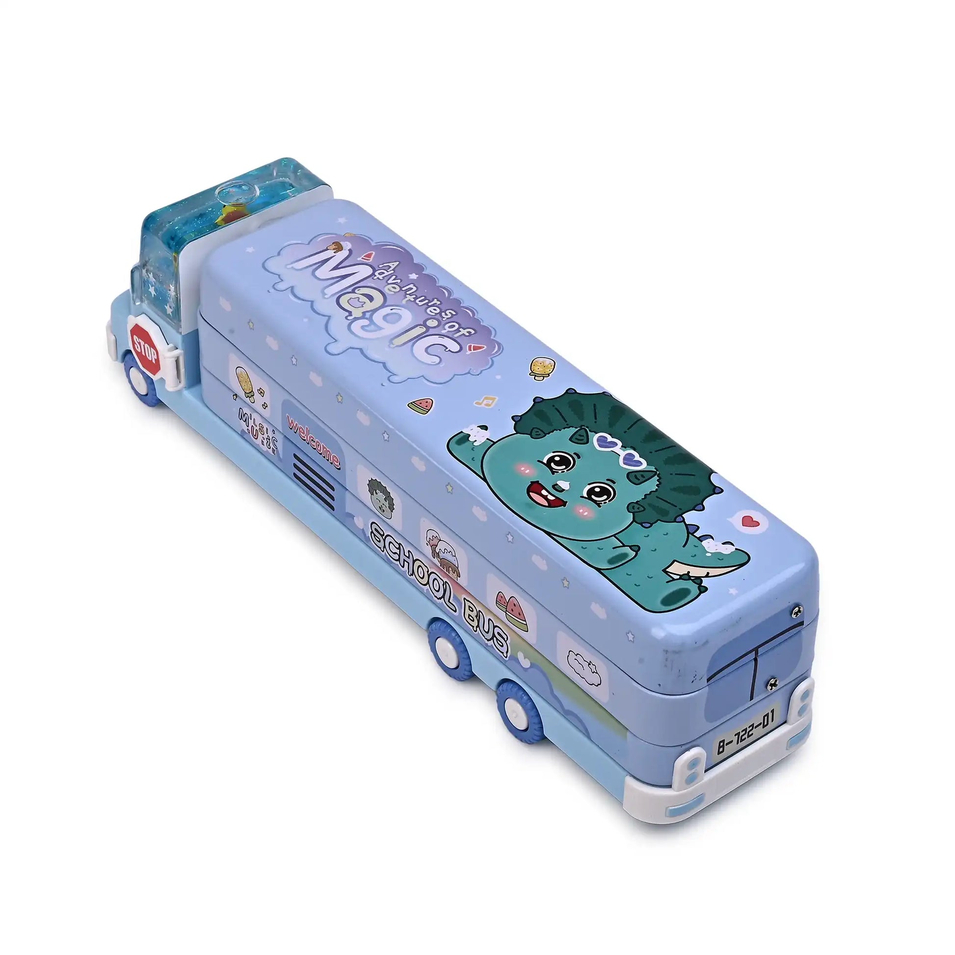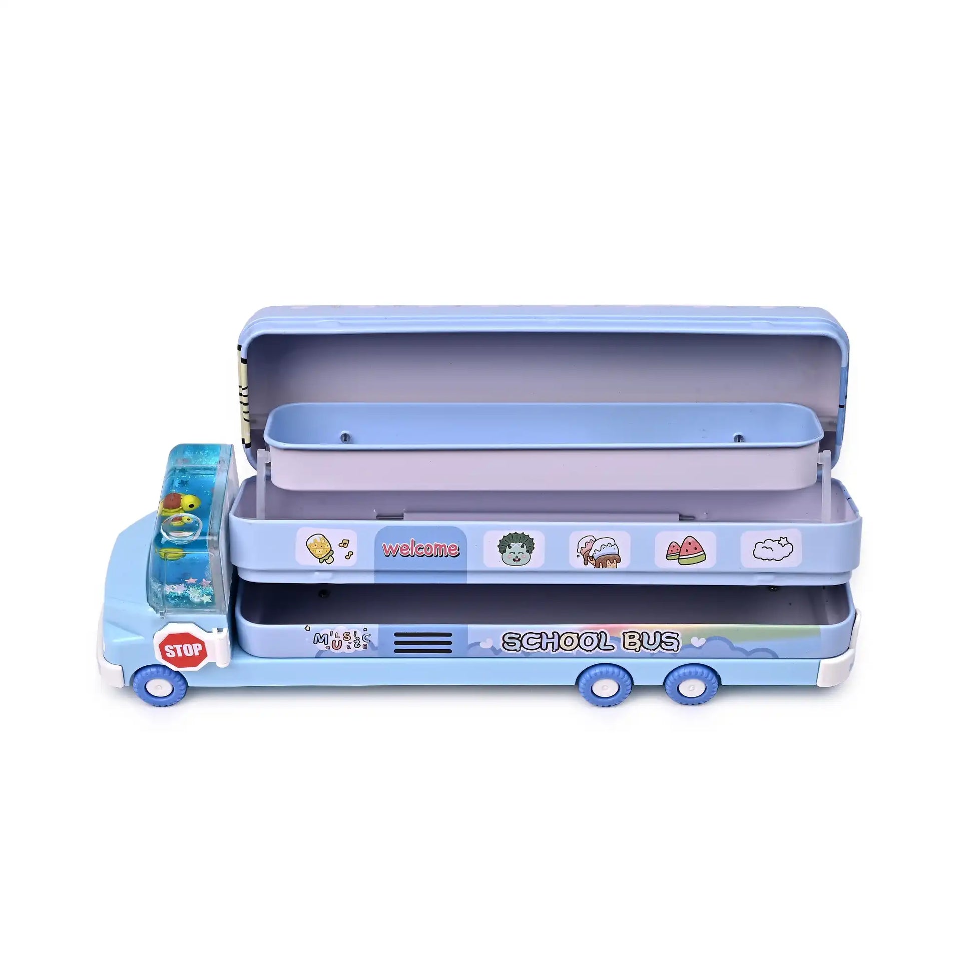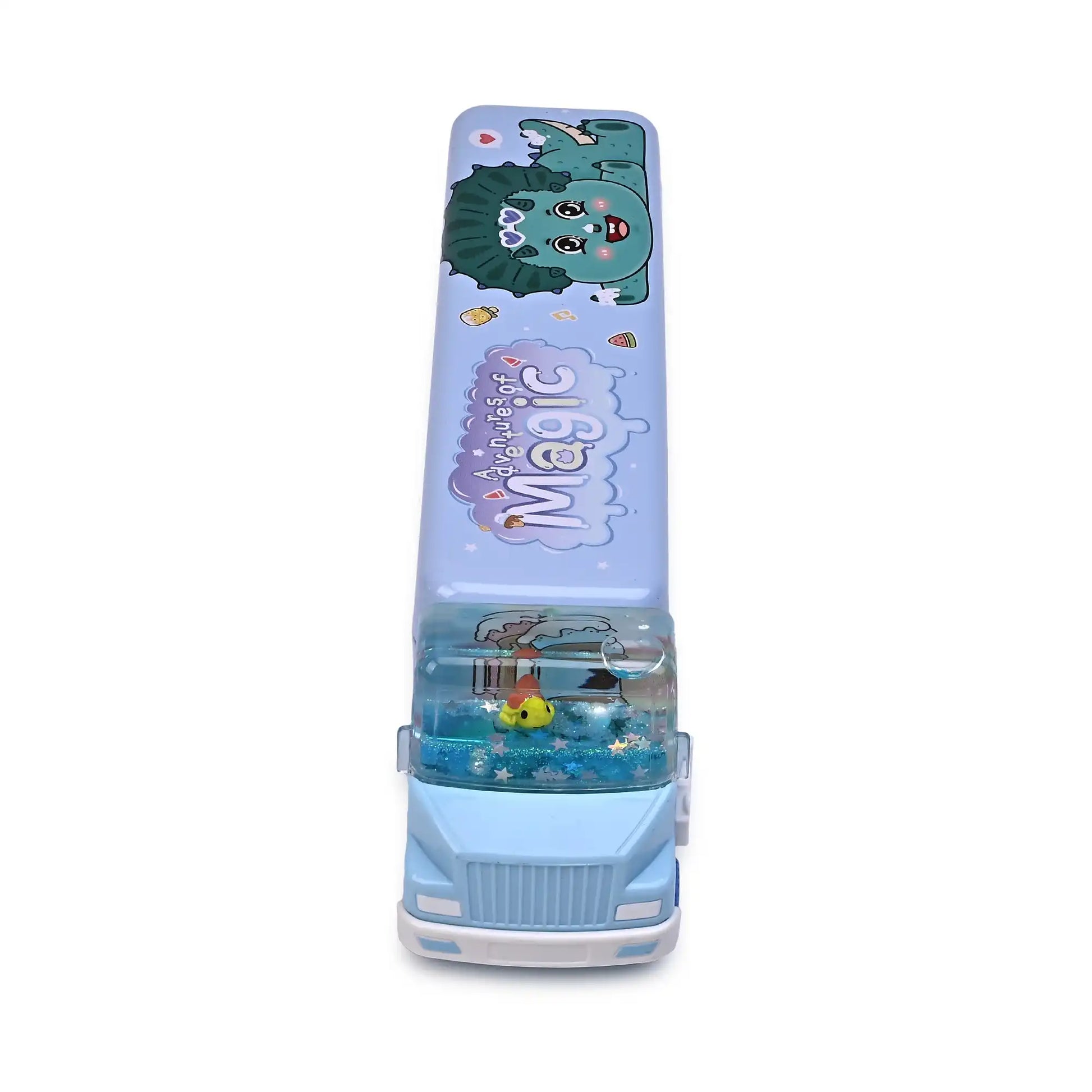 Make learning fun with this one-of-a-kind Aquarium-Themed Bus Pencil Box! Designed with a transparent water section featuring artificial fish and sparkling glitter, it gives the illusion of a mini aquarium inside a trendy bus design. With three spacious compartments, this pencil box ensures ample storage for all your school essentials, including pens, pencils, erasers, and more. Crafted from high-quality, durable material, it is both lightweight and easy to carry. Perfect for kids, students, and stationery lovers who enjoy a playful yet functional design.